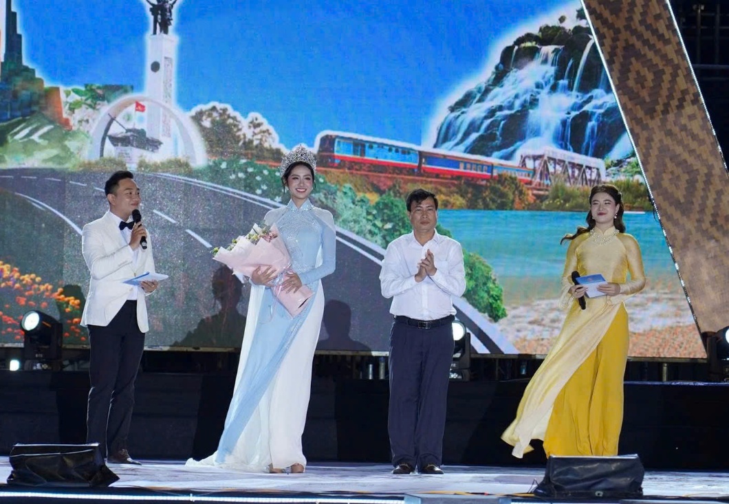 Ông Trần Hồng Tiến - Giám đốc Sở Văn hóa, Thể thao và Du lịch tặng hoa cho Hoa hậu Việt Nam Hà Trúc Linh