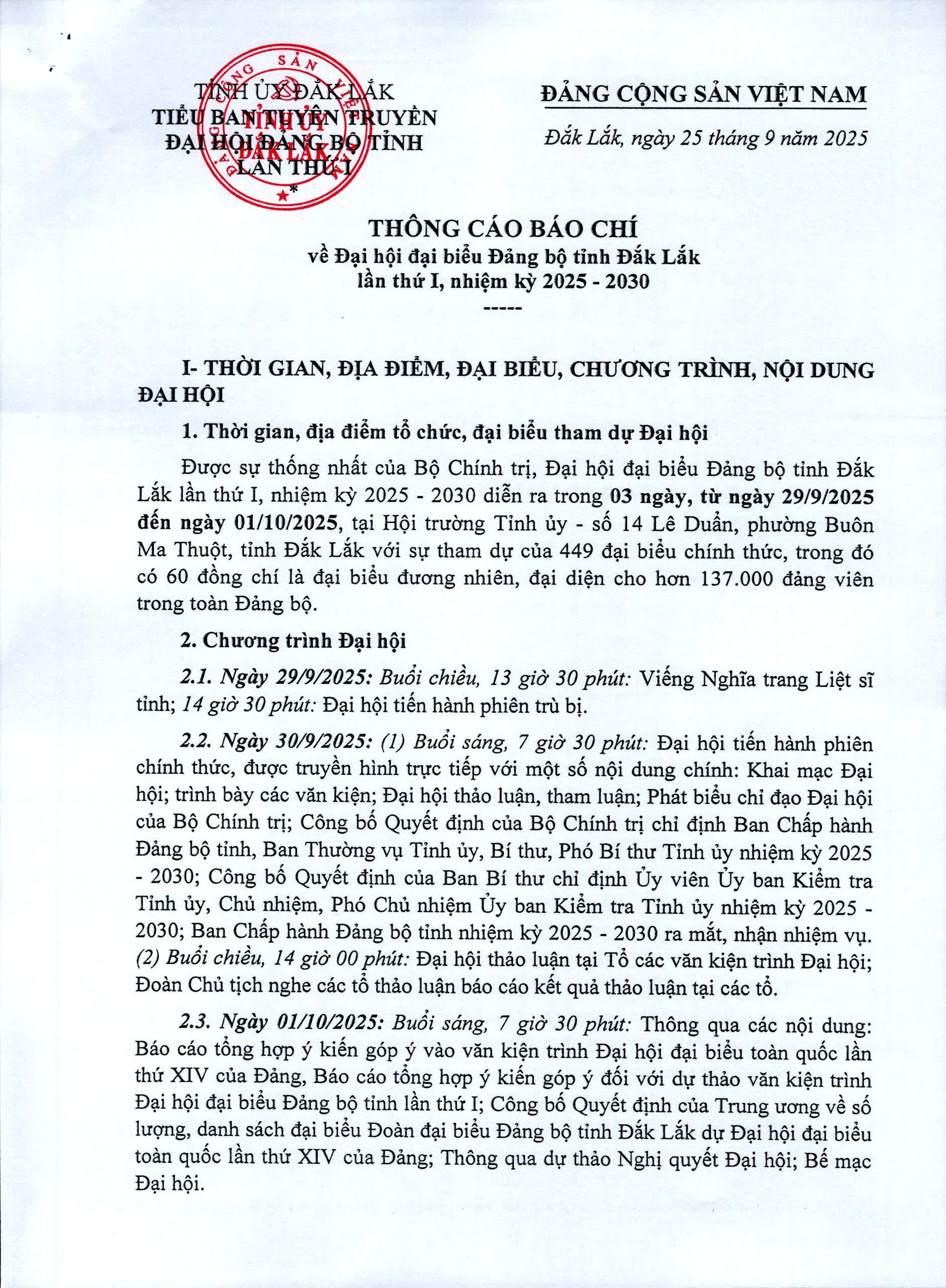 Thông cáo báo chí về Đại hội đại biểu Đảng bộ tỉnh Đắk Lắk lần thứ I, nhiệm kỳ 2025-2030