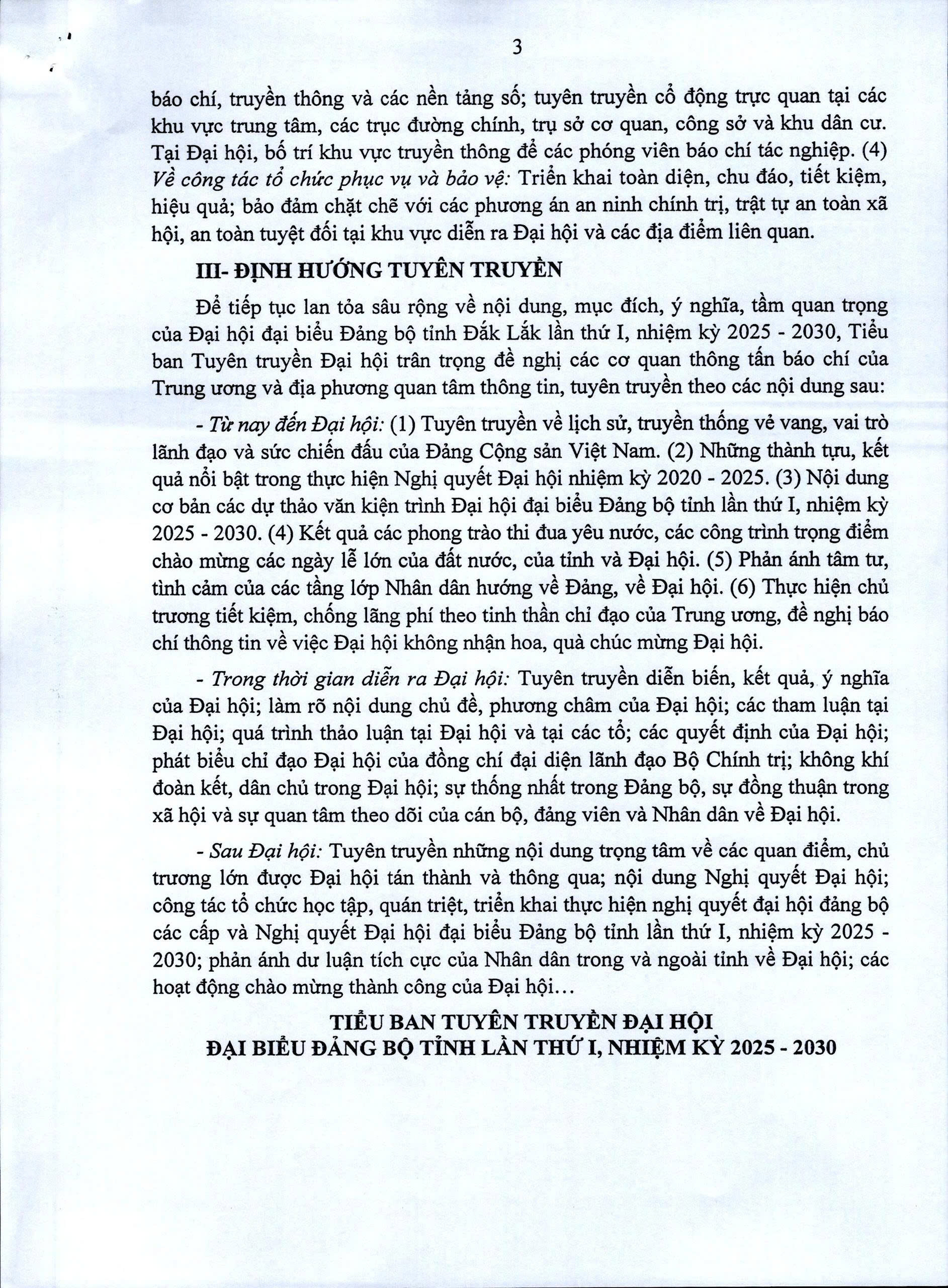 Ngày 25/9/2025, Tiểu ban Tuyên truyền Đại hội đại biểu Đảng bộ tỉnh Đắk Lắk lần thứ I, nhiệm kỳ 2025-2030 đã ban hành Thông cáo báo chí về Đại hội đại biểu Đảng bộ tỉnh Đắk Lắk lần thứ I, nhiệm kỳ 2025-2030.